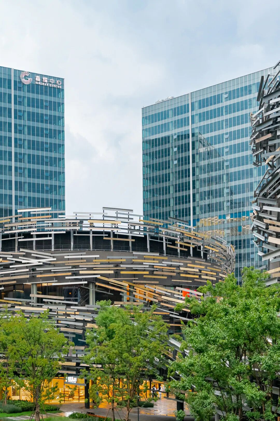 鑫耀·光环Live二期位于上海徐汇区漕河泾(漕宝路261号),由日本建筑大师隈研吾设计。其设计灵感源于“飘带”形态与“负建筑”哲学,旨在让建筑融于环境。项目总面积约10万平方米,为集商业、文化与办公于一体的综合体。其核心设计为“音宇宙LIVERSE”双子星剧场,外立面采用数千块参数化铝板编织出交织流动的钢结构形态,形成强烈的“鸟巢”视觉标识,在光影下呈现动态的“光之涟漪”效果,成为区域地标。