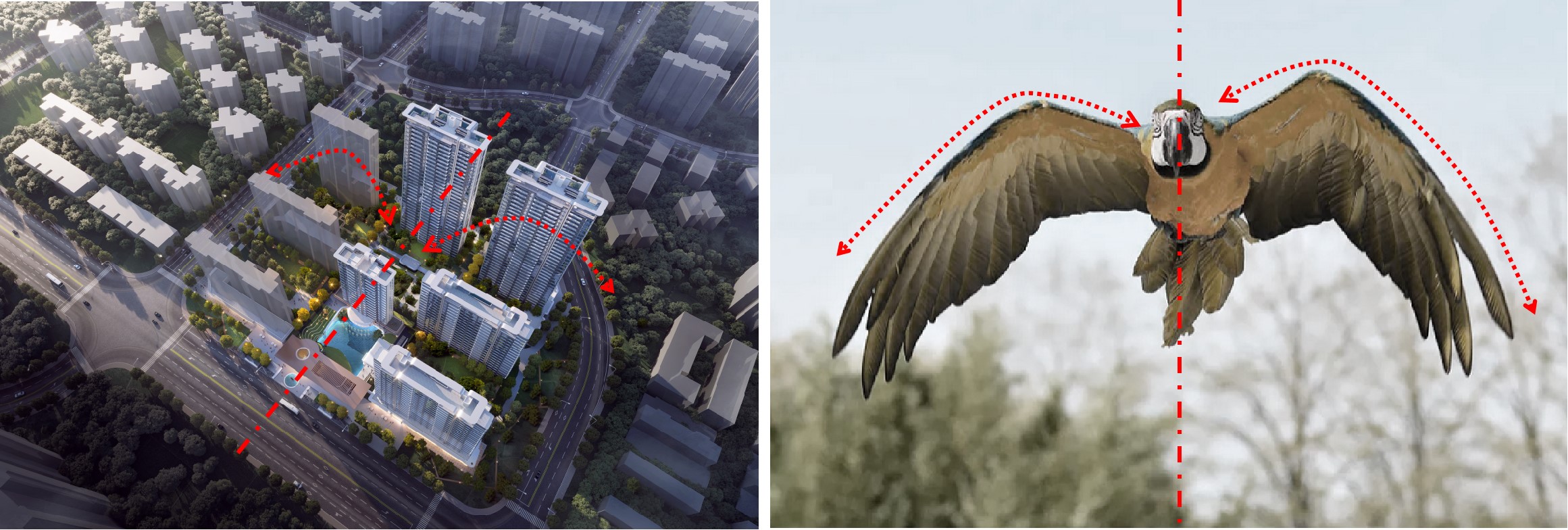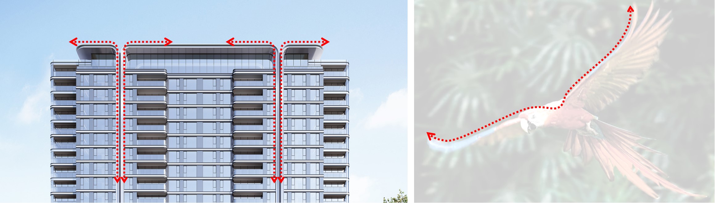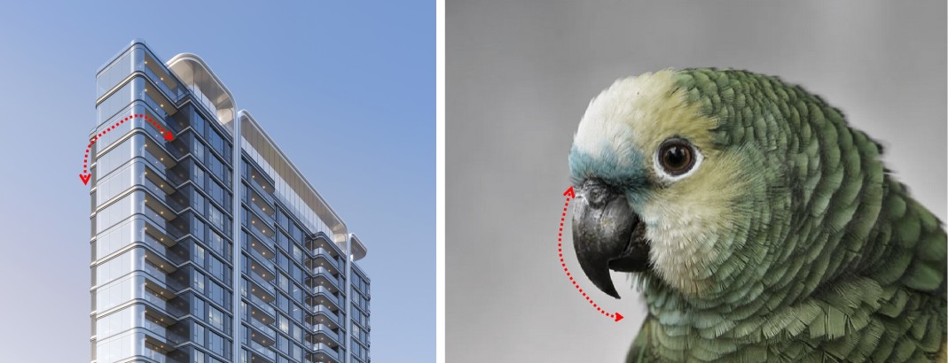 Extract the parrot's curved beak as a visual symbol of intelligence and technology, and apply it to the panoramic cabin curved window system. The curved curtain wall maximizes the attraction of scenery into the room, enhances the width of the field of view and the quality of living, reflecting the unity of science and aesthetics.