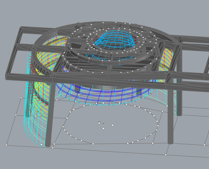 Implement overall 3D modeling of the curved surface and cantilevered keel system, complete stress analysis and section optimization design through SAP2000, ensure structural safety, and provide precise technical support for special shapes.