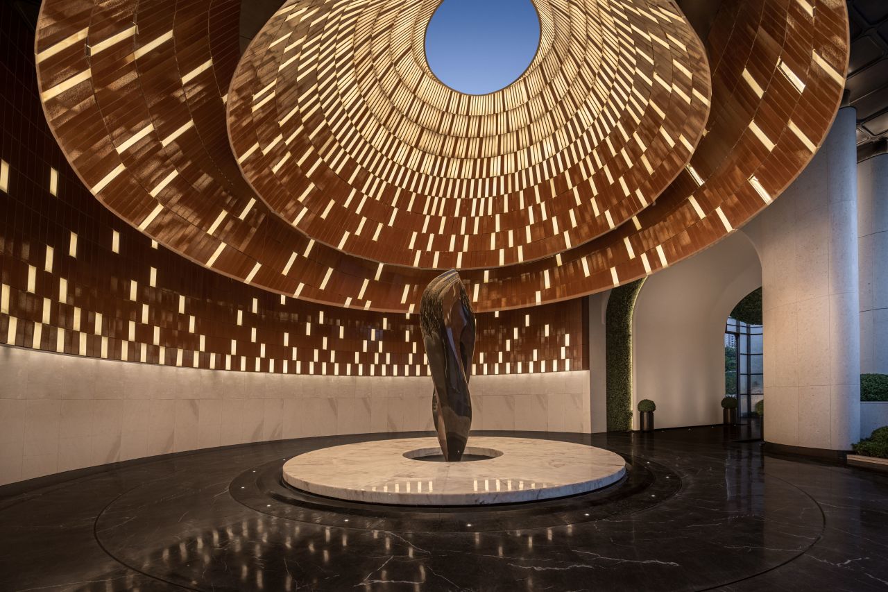 The central scenic wall is engraved with panpipes and woven with translucent marble display windows, endowing the space with divinity. Between day and night, it is like a grand ensemble of "Chu Palace Banquet Music".