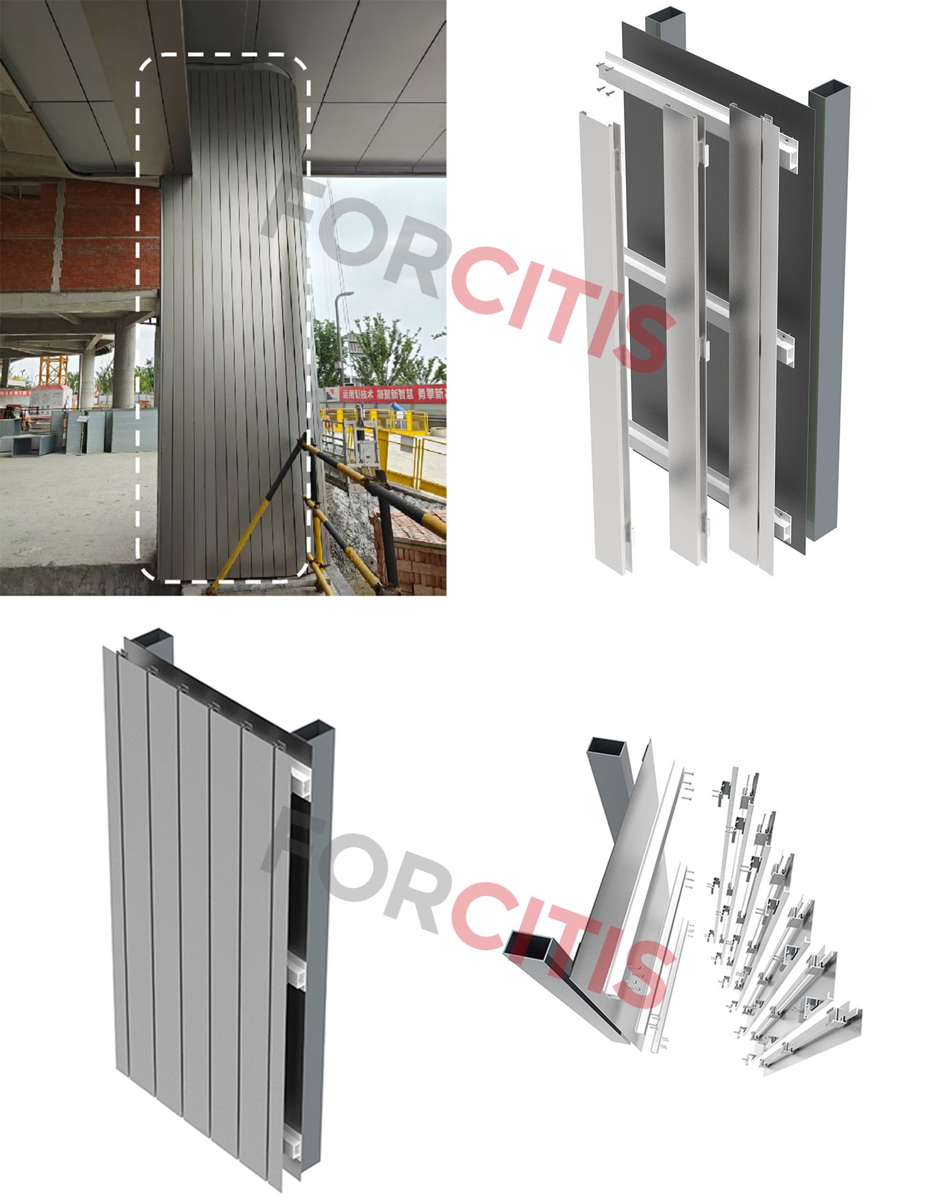 The stainless steel pillars at the lobby entrance feature an open buckle design, allowing stress to be released between panels and adapting to minor changes in the substrate through hanging, thus ensuring the ultimate flatness of the facade.