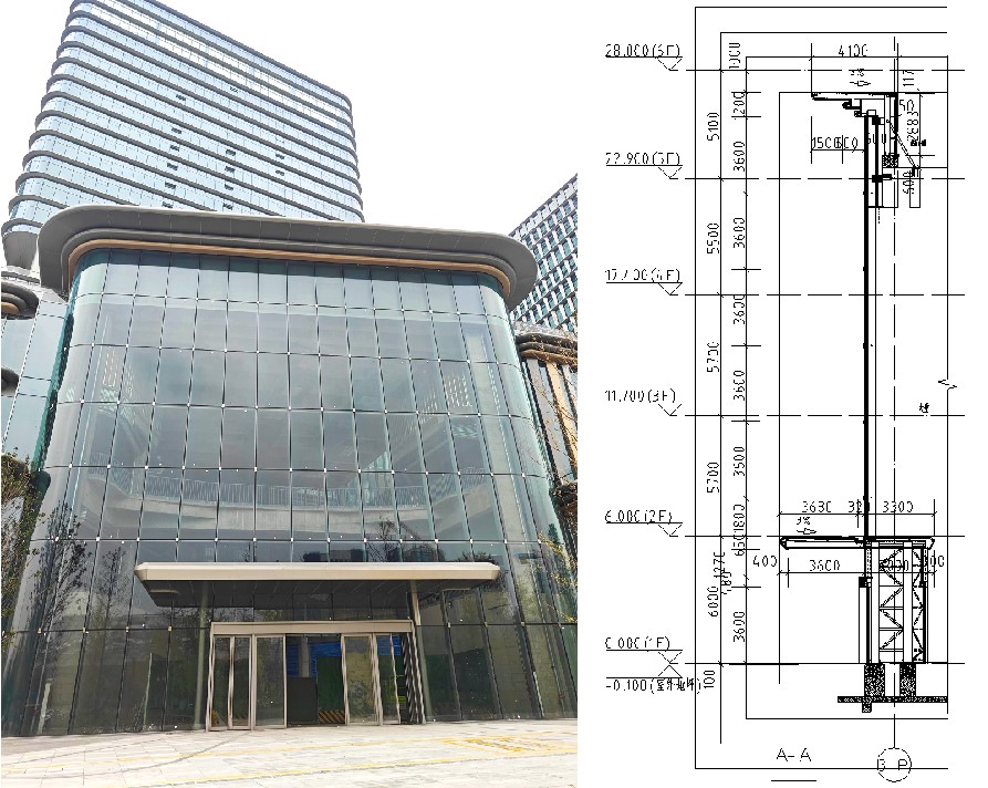The horizontal decorative lines in this project are assembled in the factory as a whole frame and installed on-site in a prefabricated manner, achieving complete detachment from the main body of the curtain wall. This allows rainwater on the glass surface to flow directly downwards along the gap between the two, while sewage on the top of the lines flows downwards through a specially designed aluminum alloy drip at the front end, preventing sewage from flowing down the lines. This measure effectively reduces on-site procedures and enhances installation accuracy and efficiency.