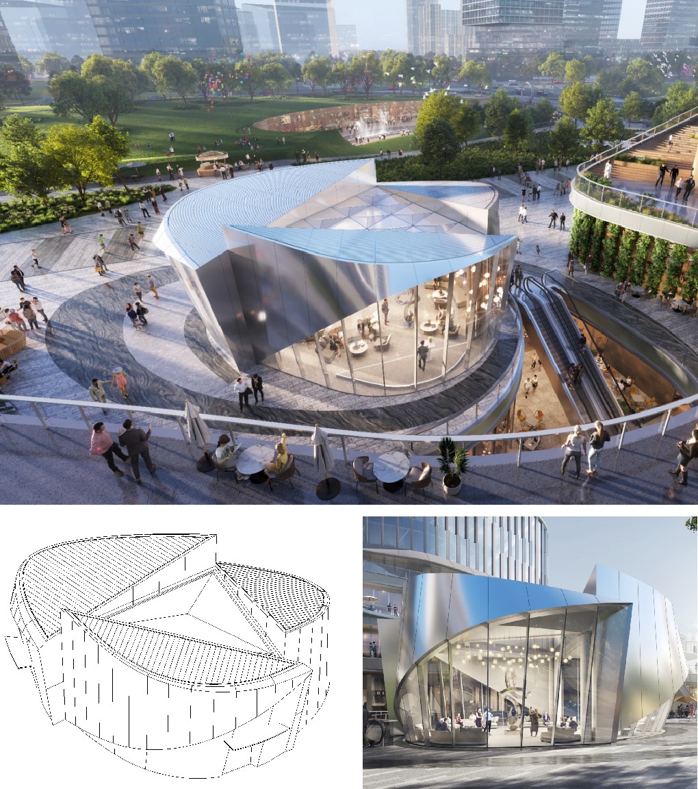 The main store "Lotus" boasts a unique design, featuring a complex hyperbolic structure. To achieve an extremely transparent visual effect, the facade is constructed using hyperbolic ultra-clear glass and 20mm thick honeycomb apple sand stainless steel plates, posing extremely high demands on materials and construction.