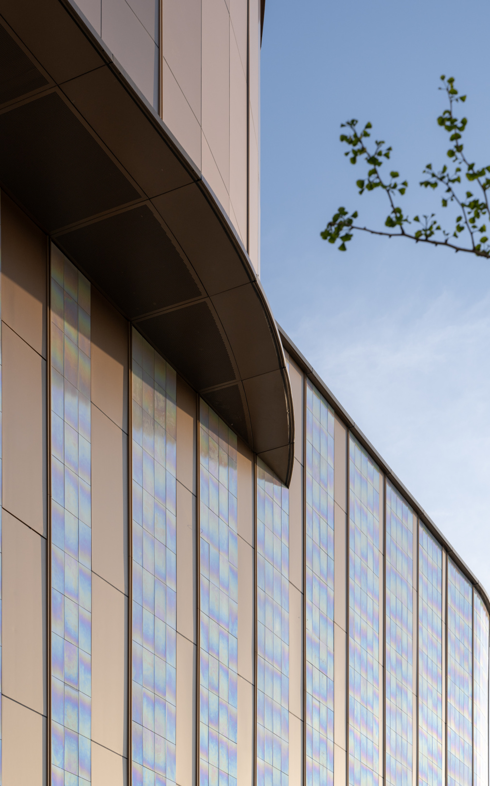 存在于各个立面的三层以上的渐变铝板幕墙,采用错落有致的蜂窝铝板分布排列,根据不同的颜色(金色与银灰色)交织,宛如流光溢彩的飘带,赋予建筑轻盈灵动之姿。