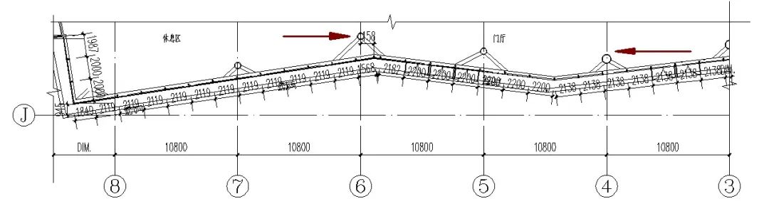 北侧屋盖外部全采用铝板的材质,每块铝板都是平行四边形,通过平面上角度的变化形成锯齿形的平面效果,在阳光下形成丰富的光影变化。细节设计上,在每两组铝板相交的阳角处设置长短不一的LED灯带,两块铝板交接处预留豁口,豁口处设置透明亚克力板内藏LED灯带。