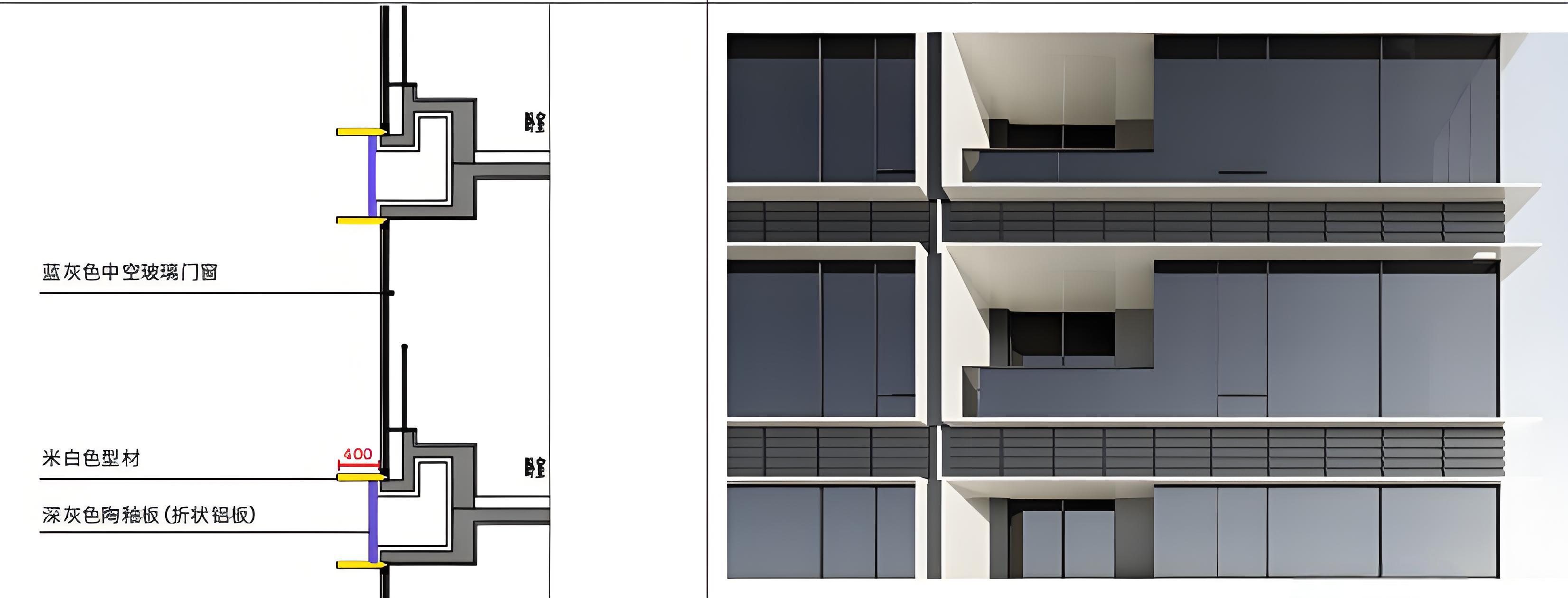 针对上述痛点,我们的解决策略围绕“以构造服务于美学”展开:将铝合金窗套与层间造型一体化设计,通过定制型材与精细化节点,在遮蔽结构的同时塑造连续、干净的视觉界面。