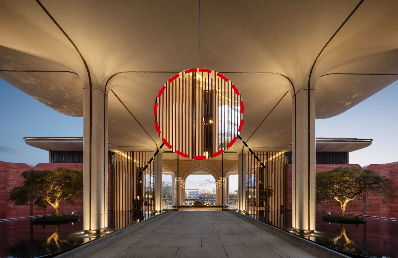 建筑立面独创 “金镶玉”美学,以大规模定制“长安红”釉面陶板为肌理,镶嵌于精工金属骨架,呈现玉质光泽与现代线条。室内实现360°环幕视野,达成建筑消隐于自然的 “无界”体验。