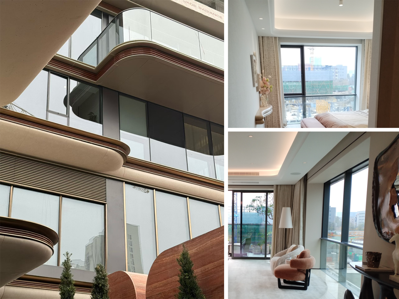 落地窗优化设计:落地窗设计采用防火玻璃栏板,优化结构,在确保防火、安全防护的前提下,巧妙地保证建筑外立面的整体协调与统一,满足室内空间对极致通透性的追求,同时便于进行清洁与维护常保卓越品质。