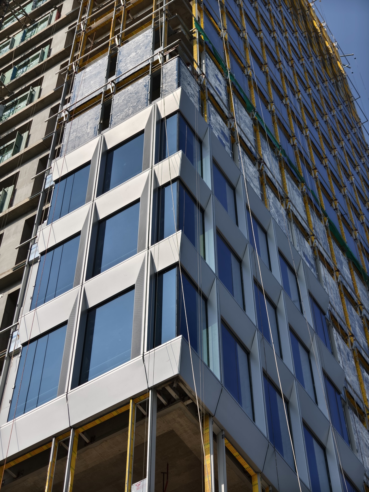 在幕墙大面积上墙前的阶段,再次进行实体VMU样板的施工与测试,确保每一个细节都符合高标准要求。进行了20多次现场巡查,配合现场问题解决,确保了项目的顺利推进。