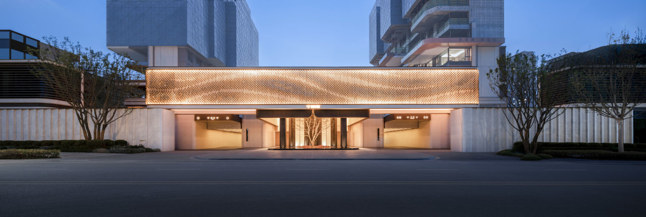 Under the challenge of canceling architectural niches, cleverly adding overhead lighting fixtures enriches the layers, making the curtain wall like flowing light woven brocade, shining brightly in tranquility.
