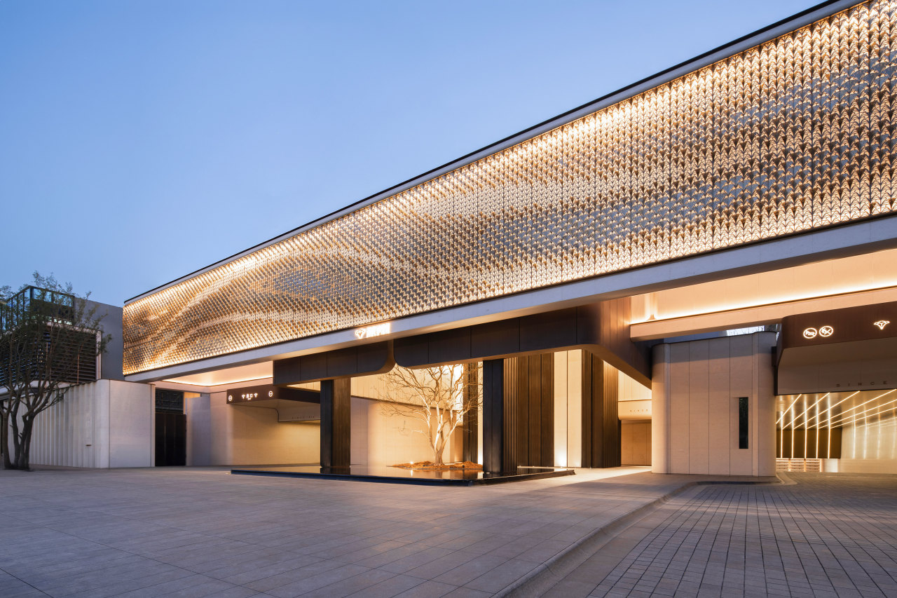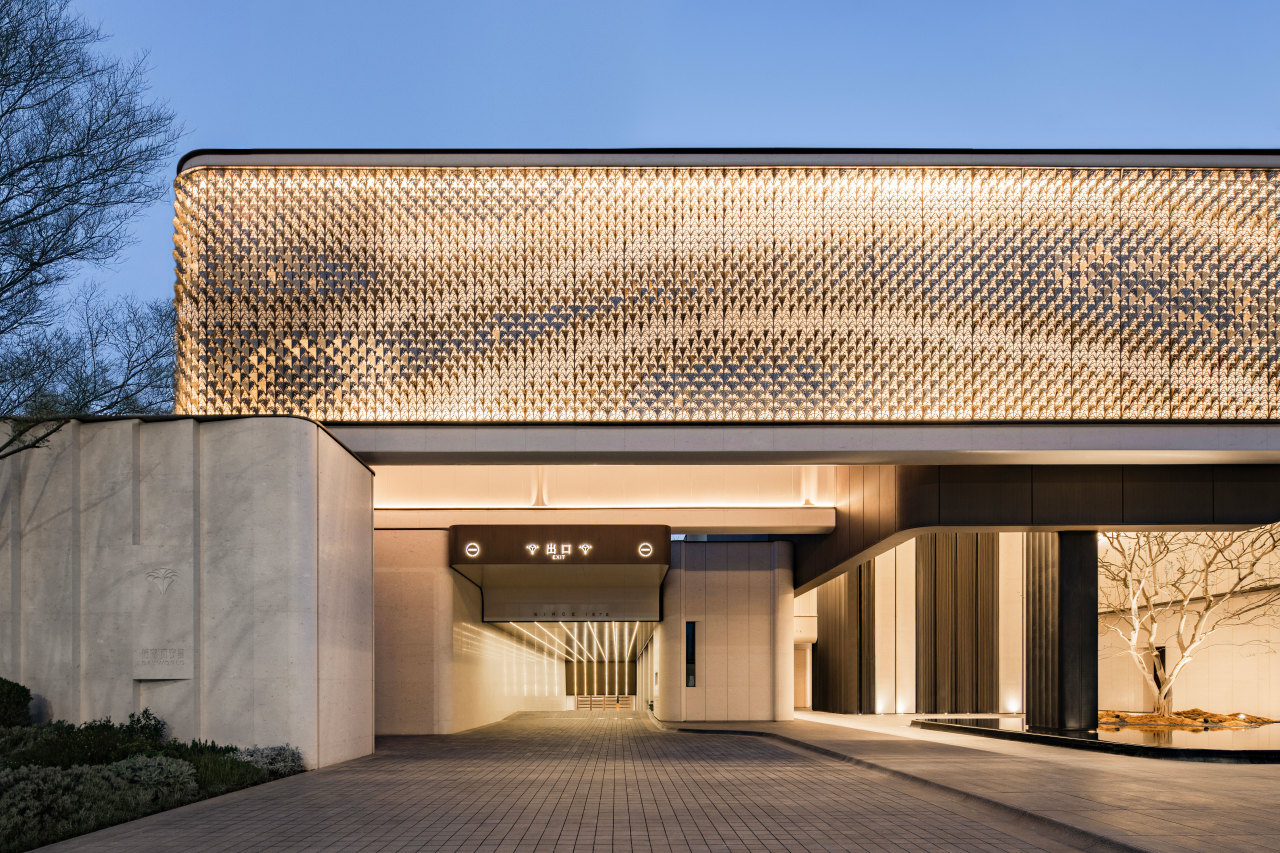 The parameterized curtain wall at the main entrance is symbolized by ten thousand gold-plated camellia flowers, and simulates wind marks through customized bending angles to form multi-dimensional light and shadow changes.
